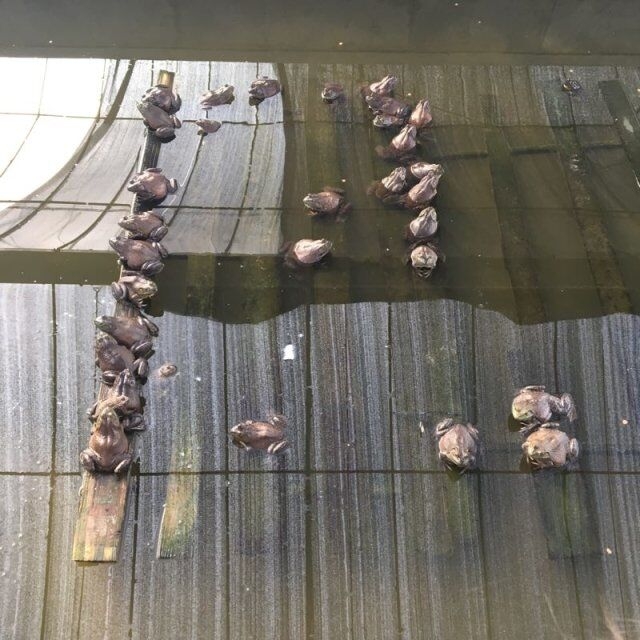 在易经理的带领下,同学们来到了养殖基地的人工养殖棚。南虎纹蛙本来生活在热带,到了上海不能自然越冬,需要人工营造小环境,于是蛙池里装了供暖设备,冬天保持在15℃以上。除了繁衍小青蛙之外,基地还大力推进海南种和本地种的杂交实验,希望能够培育出在田间能自然过冬的新品种。