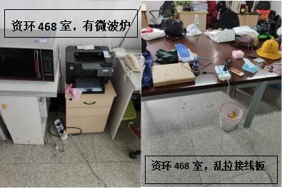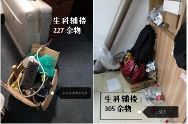 本次检查中几乎所有学生办公室和实验室都存在着大大小小的安全隐患,其中最差学生办公室为生科辅楼一楼113室(甄广印、徐娟、邓杰、蔡永立、韩骥、刘敏学生),最差实验室为生科辅楼112室(甄广印、徐娟、邓杰学生)。检查中发现最普遍的问题是堆放杂物,其他明显的问题有接线板乱拉乱放、做实验穿着不当、办公室使用微波炉等。希望老师和同学们认识到安全问题的严重性,多加重视与防范,发现问题及时改正!