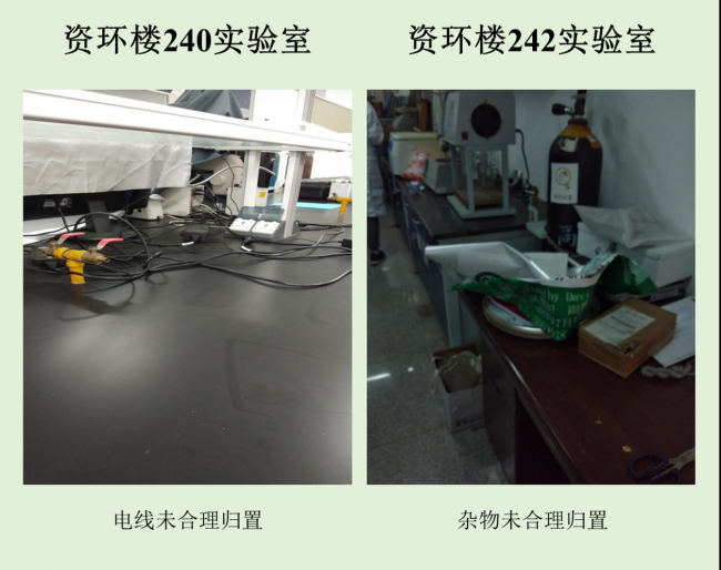 在本次检查的实验室中,资环楼142情况最佳,资环楼446室情况最差。小卫士们总结发现,实验室的评分除了整洁程度影响外,也受实验人员穿着、操作是否规范的影响。老问题如实验试剂,物品随意摆放,电线缠乱,做实验不带手套不穿实验服等有待解决,新问题如实验室带入食物,私拉电线,地面油渍溢出等需要重点关注。另外特地表扬生科辅楼112将值日表,角落堆放钢瓶等问题,生科辅楼302插座串接问题得到整改,生科辅楼309新配备实验垃圾和生活垃圾桶,建议其他实验室效仿,减少垃圾到处丟置现象,生科辅楼309,资环楼228,440,450,458台面清洁整体尚可。