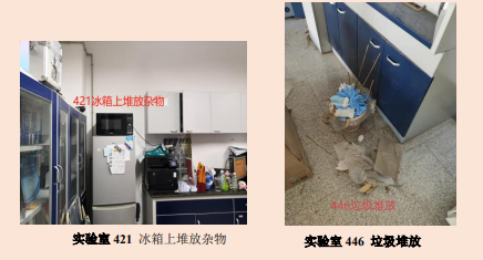 此次安全检查将检查重点放在实验室部分。对实验室卫生、仪器放置、废弃物处理、实验人员安全防护等进行了专项检查,检查结果如下。对于检查中发现的问题与隐患,小卫士们进行了拍照记录与整理。