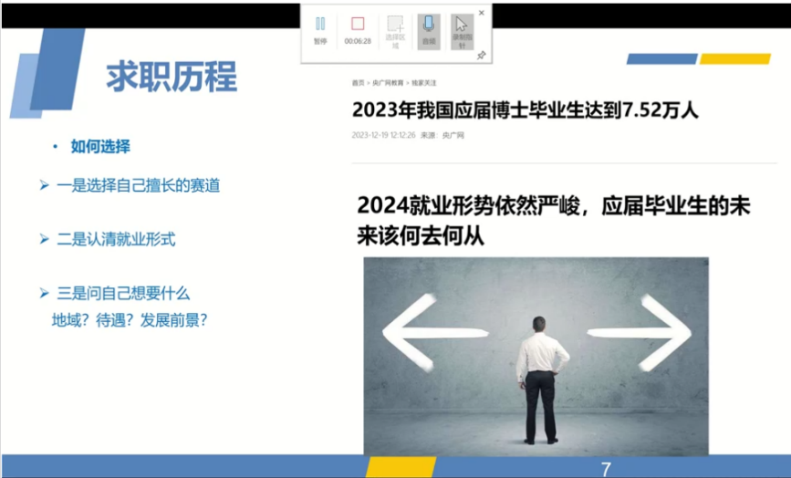 最后一位分享的是李根同学,他目前就职于生态环境部太湖流域东海海域生态环境监督管理局生态环境监测与科学研究中心。他首先比较了博士毕业生就业四大方向,即企业、公务员和事业单位、高校,以及创业的优缺点。然后,他强调求职时信息收集和自我认知的重要性,要选择自己擅长的赛道,要认清就业形势,同时也要遵从自己内心。此外,他还分享了入职一年的心得,鼓励同学们在未来职场中要不断学习、减少焦虑、保持积极的心态。