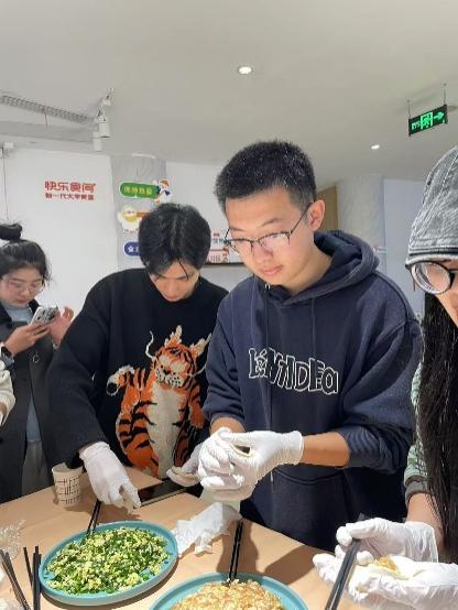 活动伊始,食堂工作人员端上精心准备好的饺子皮和馅料,并现场向同学们教学包饺子的技巧。同学们各自组成小组边学边包,期间与其他同学交流心得,不仅学会了中国传统手艺包饺子,还增进了同学们的友谊。