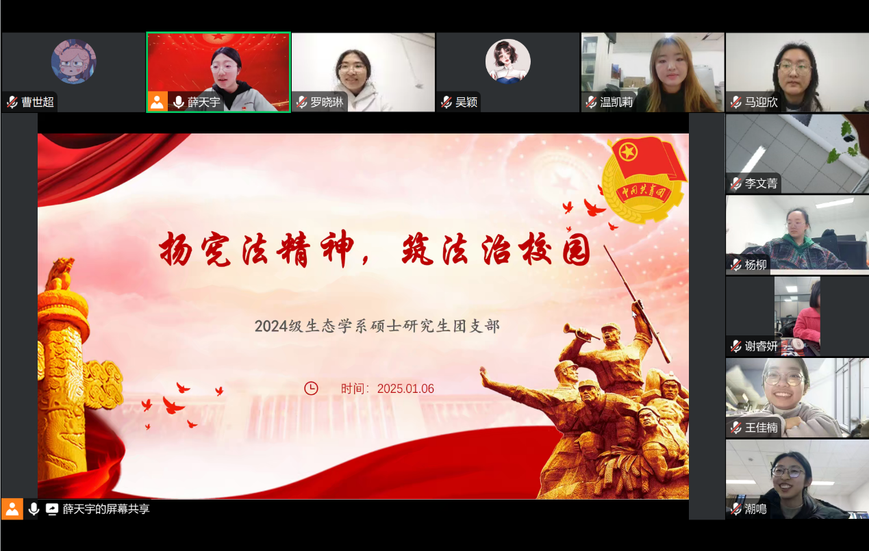 良法善治,民之所向。在法治社会建设进程中,宪法作为国家根本大法,规定了国家的根本制度和根本任务,是维护国家统一、民族团结、社会稳定的法律基础。为深入学习贯彻宪法精神,强化学生法治观念,厚植校园法治文化,2025年1月6日,黄色直播 2024级生态学系硕士研究生团支部开展“扬宪法精神,筑法治校园”主题教育活动。