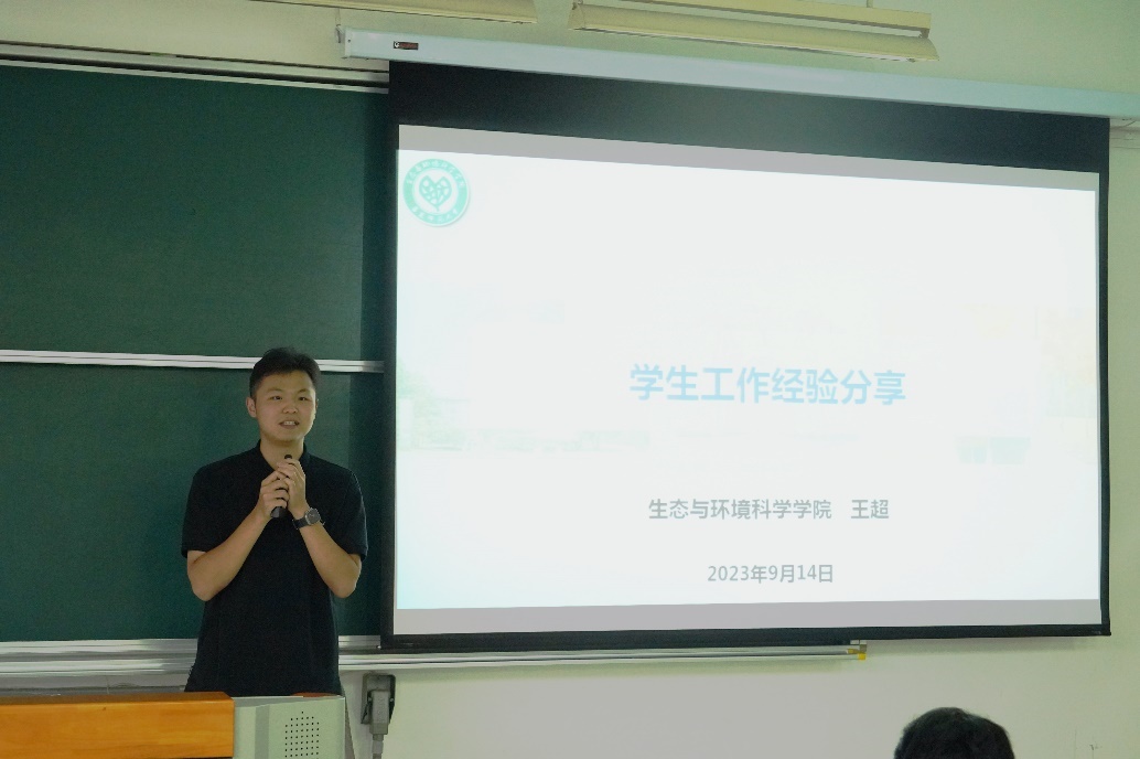 王超同学先向各位研一新生分享了自己心目中学生工作的“初心”与“使命”,向大家逐一介绍自己在学生工作过程中秉持的观念,随后详细地阐述生环研会在学年中举办的各类活动与品牌活动,在展示活动内容的同时,也介绍了自己对举办、参与研会活动的收获和体会。王超同学在谈及个人心得体会时,指出在参与学生工作的同时也需要平衡好学习和生活,达到“学生工作-生活-学习”三者的平衡,并结合自己在研会工作的收获,鼓励大家参与到研会的工作与活动中。