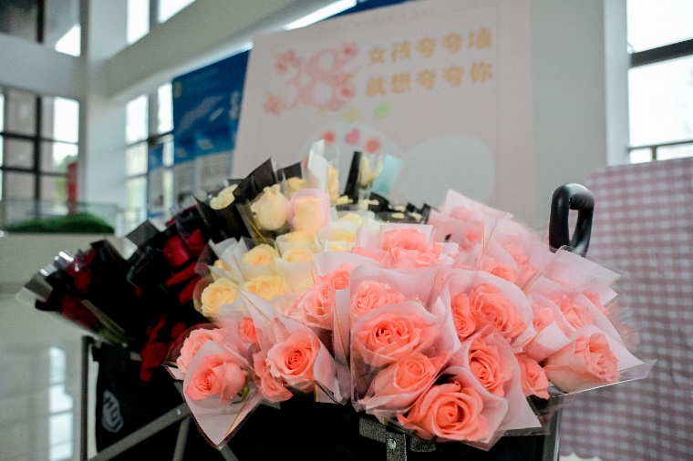 活动现场,寓意着美好祝福的鲜花已整齐摆放,粉白相间的"女孩夸夸墙"立于大厅中央,成为当天最亮眼的打卡点。