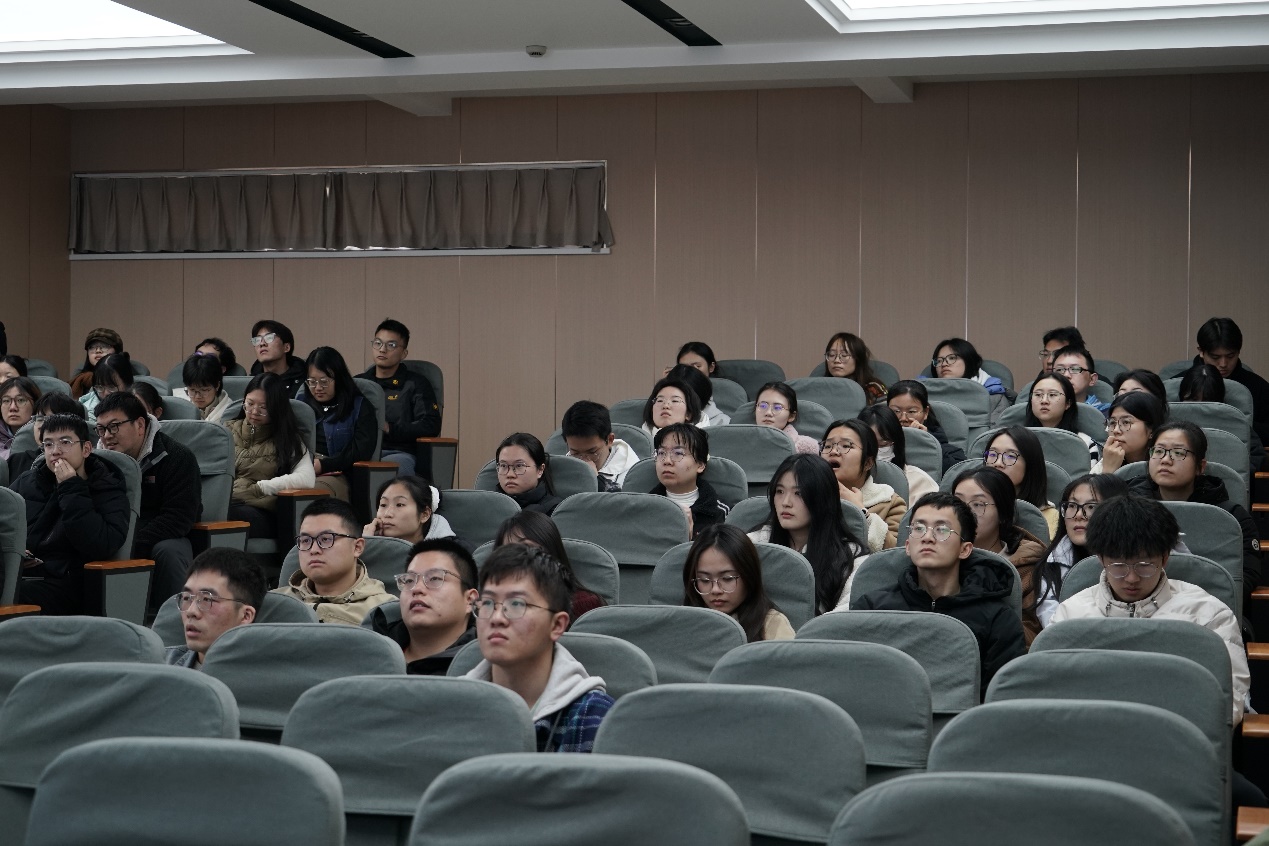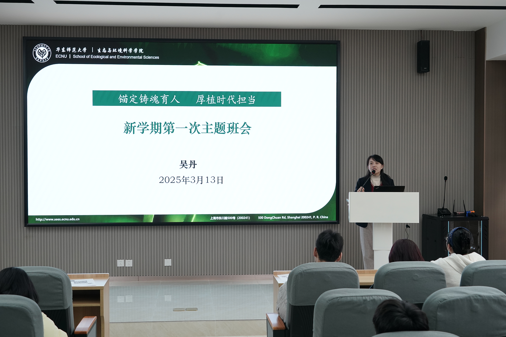 随后,吴丹老师以“锚定铸魂育人 厚植时代担当”为主题开展了新学期第一次主题班会。展望新学期,她从“思想引领、学业规划、就业实践、创新创业、校园生活”“五个方面展开。第一,思想引领方面:强调学习全国两会精神的重要性,引导同学们以全国人大代表和政协委员为榜样,厚植家国情怀,增强时代责任感;第二,学业规划方面:解读研究生学业奖学金、国家奖学金的申请要求,强调毕业论文开题与小论文撰写的重要性;第三,就业实践方面,介绍了目前的就业形势和本学期即将开展的就业指导活动,鼓励同学们积极参与,做好充足的求职准备,提升就业竞争力。同时鼓励加入小青杉志愿者团队,参与“生环小课堂”“低碳生活周”等志愿者活动;第四,创新创业方面,鼓励同学们积极参与“青杉杯”“双碳大赛”等各类竞赛活动,激发同学们的创新思维与实践能力;第五,校园生活方面,介绍学校心理咨询与精神卫生服务、学院公共空间改造等方面的最新进展;通过案例和事故通报,开展实验室安全和反诈教育;最后,展示了学校AI门户、企业微信等数字化工具的使用方法,为同学们的学习与生活提供便利。