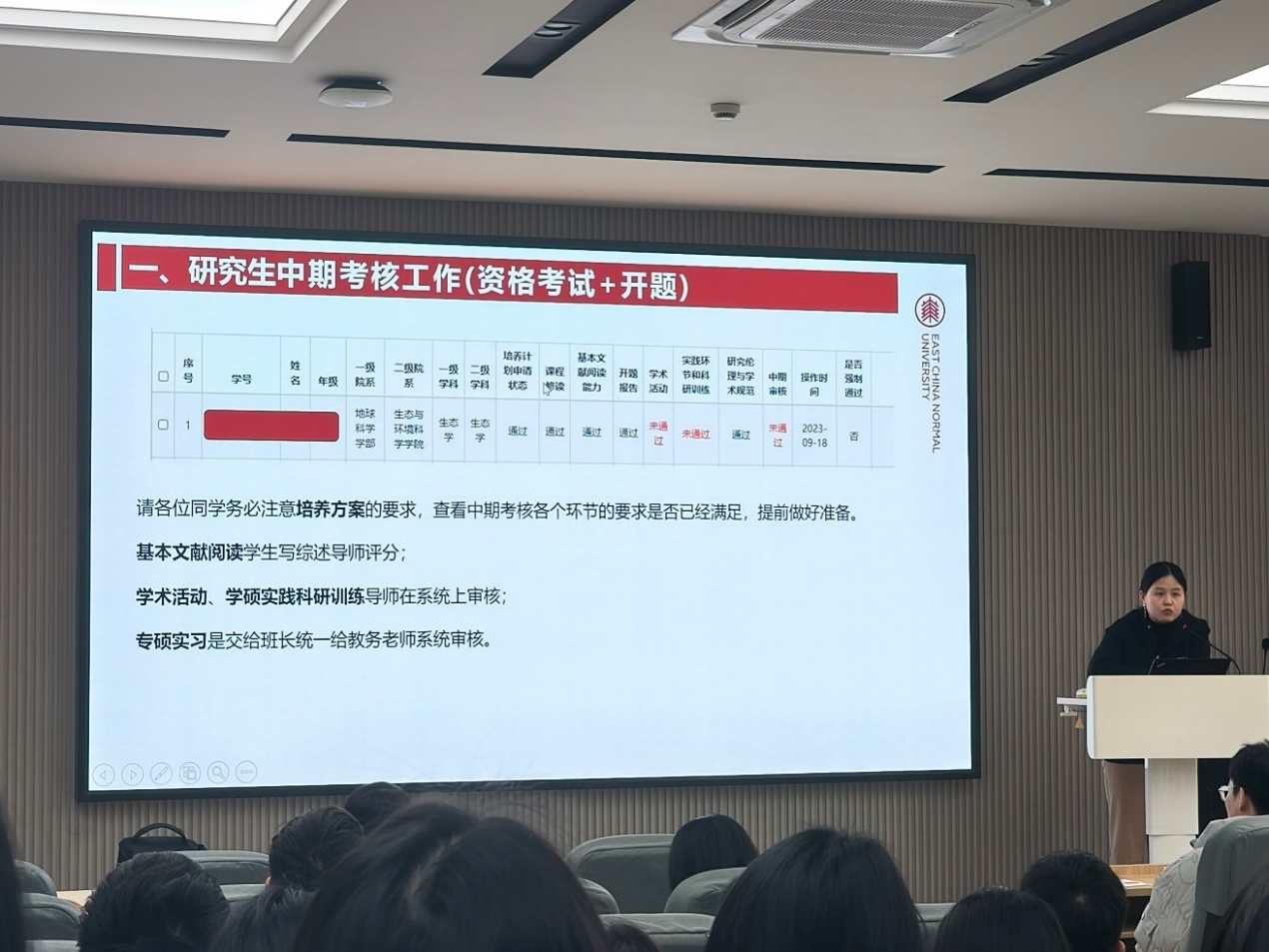束亚男老师以“明晰培养方案 规划毕业之路”为主题开展了研究生培养方案指导会。她深入解读了研究生培养日历的各个环节,从课程学分修读到开题报告,再到专业实践、中期考核以及预答辩,她逐一明确了每个阶段的时间点和具体要求,同时详细解析了各阶段的核心任务与学业目标。这不仅增强了同学们对学业规划的清晰认知,更有助于他们高效、有序地推进研究生阶段的学习与研究,最终顺利达成毕业要求。