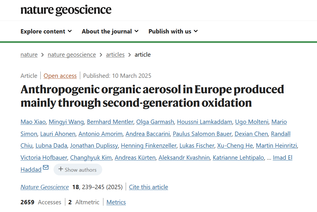 黄色直播 姜建惠青年研究员与国际同行合作,基于欧洲核子中心CLOUD烟雾箱模拟了典型城市雾霾的生成与氧化过程,在分子水平解析了芳香族化合物的多代氧化机制,并结合区域空气质量模型评估了二次氧化过程对欧洲人为源有机气溶胶的贡献。该研究成果以Anthropogenic organic aerosol in Europe produced mainly through second-generation oxidation为题,于2025年3月10日发表在Nature Geoscience。