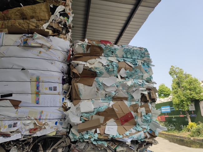接下来是废纸箱的压缩加工过程,废弃纸箱、纸盒等都变成了一个足足有一吨的立方体,同学们兴奋地上前体验这个巨大的立方体里的纸箱究竟被压的有多紧。面对同学们“纸箱会被运到哪里”、“纸箱上的颜色如何处理”、“纸箱回收利用后变成了什么”等问题,毛经理也一一做了解答。