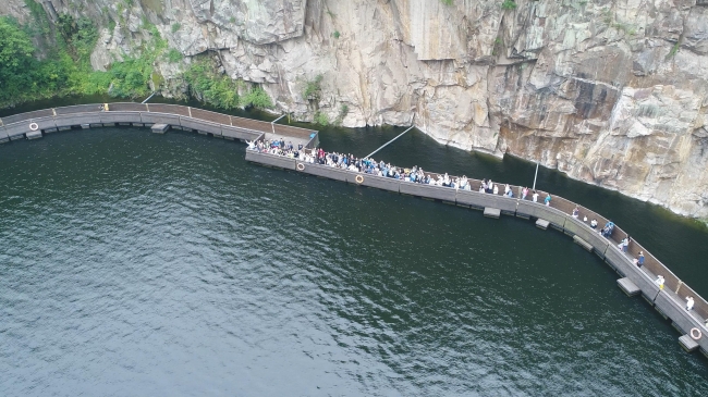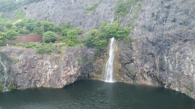 经柳林老师介绍,矿坑花园面积约39000平方米,这里原来是辰山采石场的西矿坑。根据原有生态地貌改造成了镜湖区、台地区、望花区和深潭区四个区域。矿坑花园具有优良观赏特征的乔木、低矮灌木和草本植物,包括蔷薇科、石蒜科、忍冬科、锦葵科、马鞭草科、锦葵科、菊科等1000多种植物。早在二十世纪五十年代初至八十年代中期,辰山南坡被用作开采建筑石材的场地,采石挖掘后留下东西两个采石场遗址。其中西侧采石区在山体开采完后,又向地下纵深挖掘,深入地面六十余米,形成了面积达10000平米的人工深潭,潭水水面离地面30余米,深30余米,悬崖峭壁高30100米。