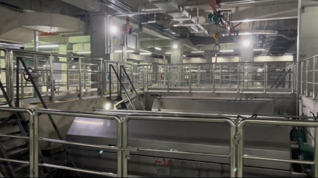 水厂运用一体化改良型AAO(厌氧-缺氧-好氧法)技术,利用微生物的反硝化反应转化水体中的硝酸盐。沿着入口进入底下的污水处理空间,一个大型加工车间映入眼帘,这就是整个污水处理厂的核心区域,干净整洁且基本没有异味。工作人员介绍,目前绝大多数污水处理厂的出水标准为一级A,而南翔下沉式再生水厂的主要出水指标达到高于一级A的地表水Ⅳ类标准,除了部分出水用于中水回用,其余高品质出水用作蕴藻浜河道的生态补水。