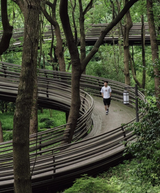 现今的西溪湿地内部自然体验设施多数是在平面上进行延伸,但是在湿地当中植被茂密的地方,垂直空间的探索更有待发掘,垂直景观廊道不断转换的高差和婉转的路线带给了游客更多的趣味性。