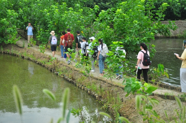 6日清晨,在桑蚕专家楼黎静老师的带领下,师生探访桑基鱼塘核心保护区。踏着蚬壳路,在郁郁葱葱的桑树荫下前行。保护区内鱼塘纵横、水光潋滟、阡陌相连、风景秀丽。通过专家介绍,同学们了解到在近年来当地政府通过桑树补植、鱼塘修复、河道疏浚等措施,对原生态桑基鱼塘系统进行了修复性保护与利用,以更好维护该重要农业文化遗产,在参观鱼桑文化研学院时,同学们也了解到当地正通过“微改造、精提升”不断延伸鱼桑文化旅游产业链,让“桑基鱼塘”全球农遗的价值得以进一步转化。