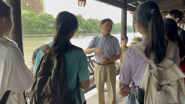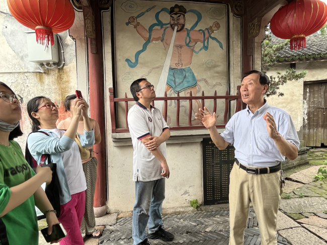 完成桑基鱼塘的考察后,在章金财老书记和邓泓老师的带领下,师生们参观了荻港村。了解到荻港村是座落在京杭大运河边典型的江南水乡古村,其历史文化底蕴深厚,从宋朝建村,至今已有千年历史。但历史的积淀为荻港村保留传统文化的同时也在某种程度上限制了发展脚步,如基础设施老旧、古迹年久失修等,如何将优越的人文资源和自然禀赋转化为全民共享的社会财富是荻港村正在努力探索的新方向。