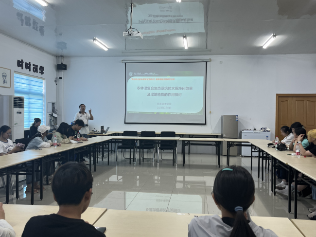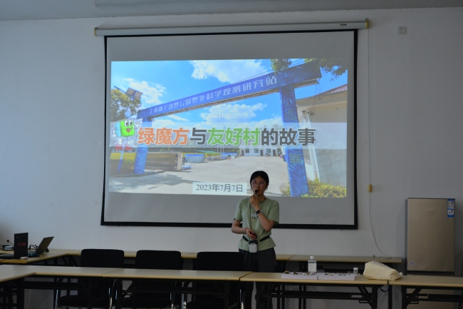 结束野外作业,师生们返回研究站。“绿魔方”团队负责人张楠学姐分享了绿魔方与友好村的故事,同学们感受到了自然生态中所蕴含的教育价值。友好村戈书记对友好村目前发展进行了简要介绍,对未来发展做了展望。学院党委书记刘婕老师发言指出,“农林水乡充分体现了‘科研、科教、科普’三科理念。”通过刘老师、戈书记及张师姐的话语,同学们对友好村是如何在农林水乡这一生态修复项目的帮助下推动生态旅游、自然教育和经济社会发展有了更深入的认识,对“两山”理论在乡村振兴中的转化路径有了更深刻的思考。