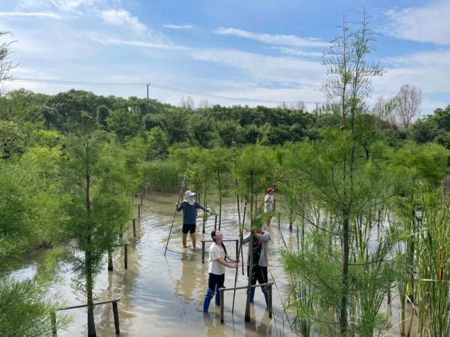 7日清晨,同学们早早出发到达农林水乡开始了最后一天的课题研究。刘婕书记也特意赶来为大家打气加油。助教王小玲为两组同学讲解“小气候与大气环境污染物移动监测系统”的使用方法,随后两组同学在宋坤老师和助教们的带领下出发,开始农林水乡环境因子的测量并基于已调查的土地利用类型开展植被调查;另外两组同学在陈雪初、黄莹莹老师及助教们的带领下开展了水上森林中池杉和落羽杉生长状况的调查。