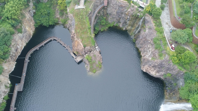 经柳林老师介绍,矿坑花园面积约39000平方米,这里原来是辰山采石场的西矿坑。根据原有生态地貌改造成了镜湖区、台地区、望花区和深潭区四个区域。矿坑花园具有优良观赏特征的乔木、低矮灌木和草本植物,包括蔷薇科、石蒜科、忍冬科、锦葵科、马鞭草科、锦葵科、菊科等1000多种植物。早在二十世纪五十年代初至八十年代中期,辰山南坡被用作开采建筑石材的场地,采石挖掘后留下东西两个采石场遗址。其中西侧采石区在山体开采完后,又向地下纵深挖掘,深入地面六十余米,形成了面积达10000平米的人工深潭,潭水水面离地面30余米,深30余米,悬崖峭壁高30至100米。