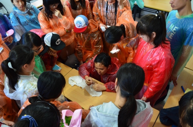 学生测量时被尺划伤,路葵老师正在给学生包扎