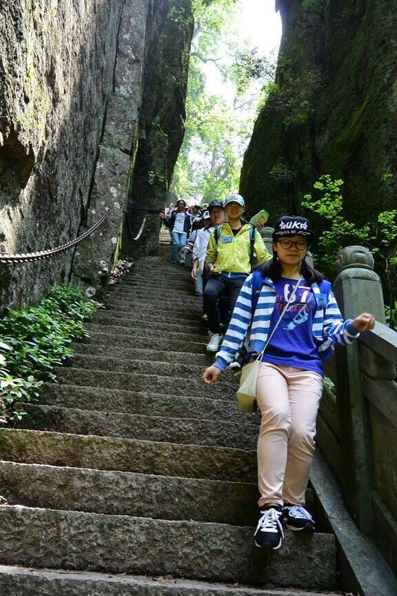 学生正在通过垂直高度为四十余米的一线天石阶
