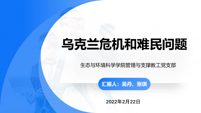 2022年2月22日下午,生环学院管理与支撑教工党支部在资环楼146举办第四场寒假学习分享主题活动,分享人是陈然、吴丹和张琪老师。陈然老师分享的主题是《正风反腐,必须“零容忍”》;吴丹和张琪两位老师组成小组,分享的主题是《乌克兰危机和难民问题》。