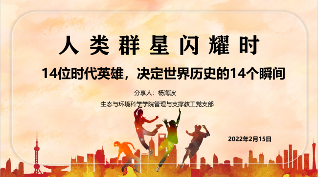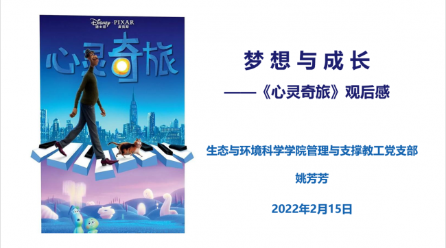 2022年2月15日下午,生环学院管理与支撑教工党支部举办第三场寒假学习分享主题活动,分享人是董舒、谭珊珊、崔玉雪、姚芳芳、宋萌和杨海波老师。董舒、谭珊珊、崔玉雪三位老师组成小组,分享的主题是《我所了解的红色舞蹈》;姚芳芳老师分享的主题是《梦想与成长——<心灵奇旅>观后感》、宋萌老师分享的主题是《传承与突破——感受2022年北京冬奥会》、杨海波老师分享的主题是《人类群星闪耀时读后感》。