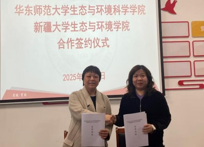 华东师大黄色直播 党委书记嵇渭萍、新疆大学生态与环境学院党委书记贡璐代表双方签订合作协议。