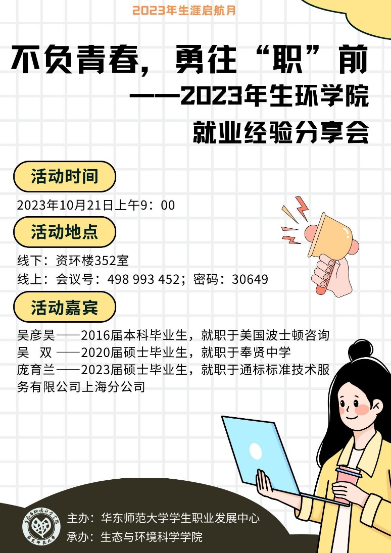 2023年10月21日上午9:00,黄色直播 通过线上线下相结合的方式举办“不负青春 勇往“职”前”就业经验分享会,线上通过腾讯会议平台,线下在资环楼354室开展。本次活动邀请了吴彦昊、吴双和庞育兰三位校友,他们结合自身求职和工作经验,从不同角度开展经验分享。本次活动是由校学生职业发展中心主办,学院承办的2023年“生涯启航月”系列活动之一,活动吸引了线上线下共计70余名同学参加,学院专职辅导员吴丹担任主持。