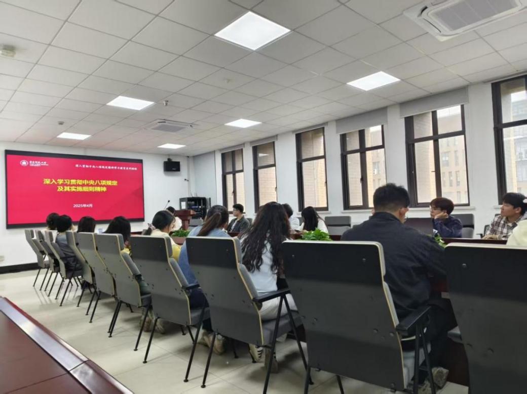 活动第一部分,由支部书记徐寒雨首先围绕中央八项规定及其实施细则精神展开专题学习。通过系统学习解读《中央八项规定精神》,全体党员要严格对照规定,加强作风建设、杜绝形式主义、厉行勤俭节约、持续强化监督检查。全体党员需以更高标准将制度要求转化为行动自觉。通过对比“中央八项规定”与“中央八项规定精神”的适用主体差异,帮助党员明确精神的针对性和广泛性,进一步增强了政治意识和纪律意识。