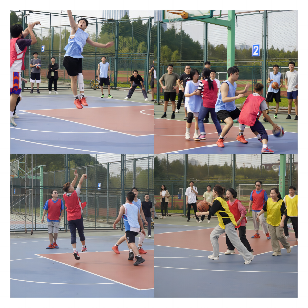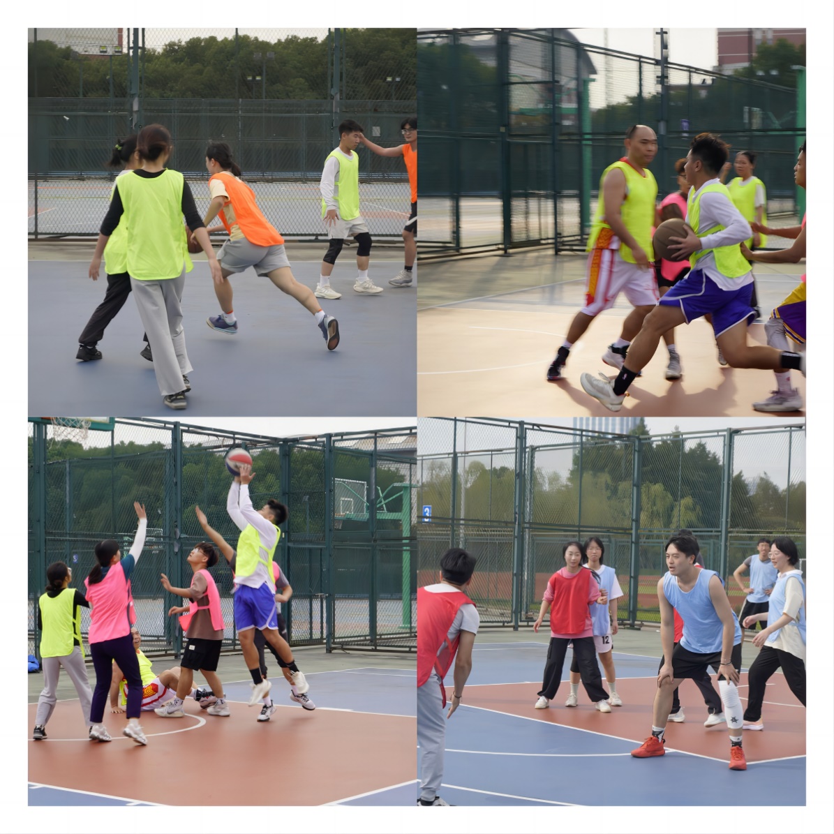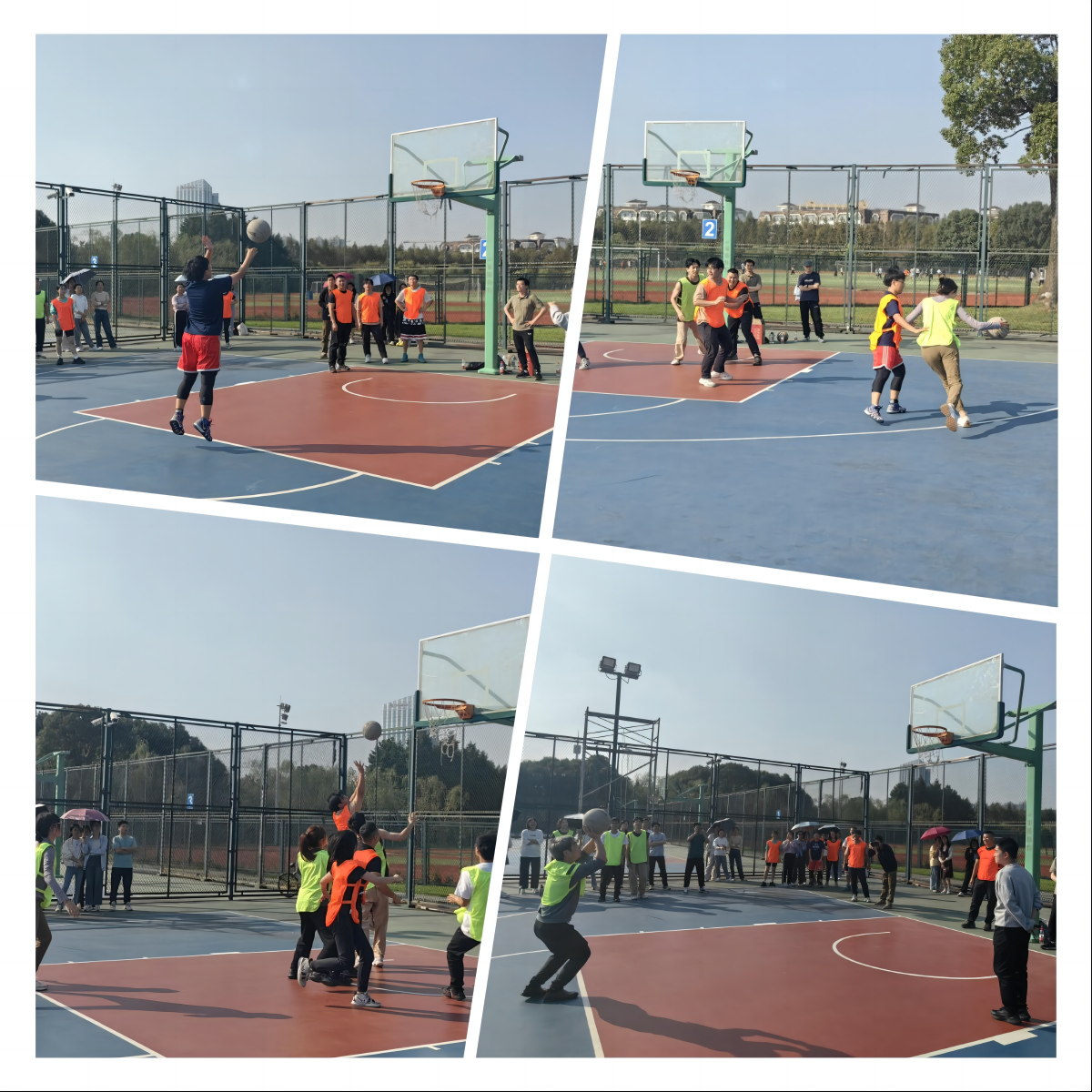 随着一声清脆的哨响,比赛正式开始,队员们迅速进入状态,各个队伍内也展现出绝佳的默契,攻守得当。“天童国家队”在最后一分钟的关键时刻保持沉着冷静,与对手拉开差距;“朵拉爱探险”虽然是第一次参加比赛,但是以非凡的截击和敏捷的速度突出重围;“环境功能材料与水污染控制队”队员之间配合无间,分工明确;“爱在171队”的曹承进老师身姿矫健,刚开局就命中一球,极大地鼓舞了队员们的士气;“蛋仔派队”运用巧妙快攻,每次都能完成精准的投射;“十全大补队”的老师们与学生之间完美配合,尤其是定点投篮命中率很高,团队士气十足。