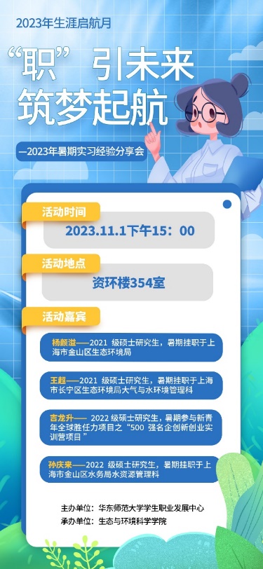 第二位分享嘉宾王超暑期于上海市长宁区生态环境局大气与水环境管理科实习。他首先强调了实习的重要性,并提出了实习的几个主要目标:深入了解行业内的具体工作内容和企业的工作环境、拓展就业方向、满足专业硕士的实践要求、丰富个人简历等。王超同学分享了自己寻找实习机会的渠道,包括通过师大青年网、黄色直播 选调生等途径获取实习信息。此外,他还分享了自己在实习期间参加各类会议、参与各项检查以及撰写各类文件的心得和经验,这些经历让他更深入地了解了生态环境局的工作流程和规定,锻炼了与人打交道的本领,提升了工作能力。