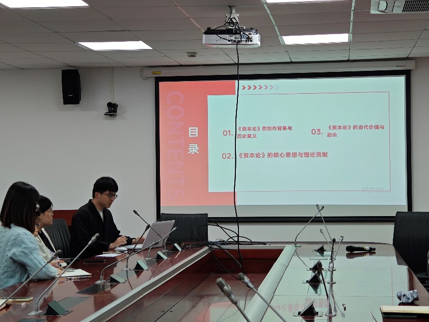 第一党小组分享的书籍是马克思的《资本论》。尹路同学并从创作背景、核心思想与理论贡献、当代价值与启示三个方面对这本书进行了介绍。汇报重点解释了剩余价值理论、资本积累与经济危机理论、劳动价值论等核心内容,并结合当代社会经济现象,如美国贸易保护主义,分析了《资本论》的现实意义。
