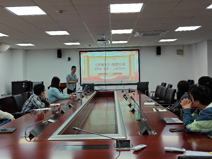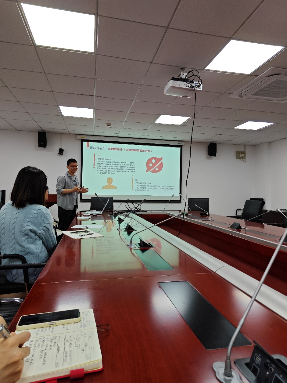 第三小组以“把矛盾‘看透’,让自己通透”为主题,深入研读《矛盾论》。孙焕法同学从矛盾的普遍性与特殊性、主次矛盾、矛盾的同一性与斗争性、矛盾的转化与解决四个方面展开汇报,并将博士生的学习工作与矛盾论的内容相结合,不仅为党员同学们提供了科学的思维方法,也为大家应对复杂问题、推动工作发展提出了一些宝贵建议。