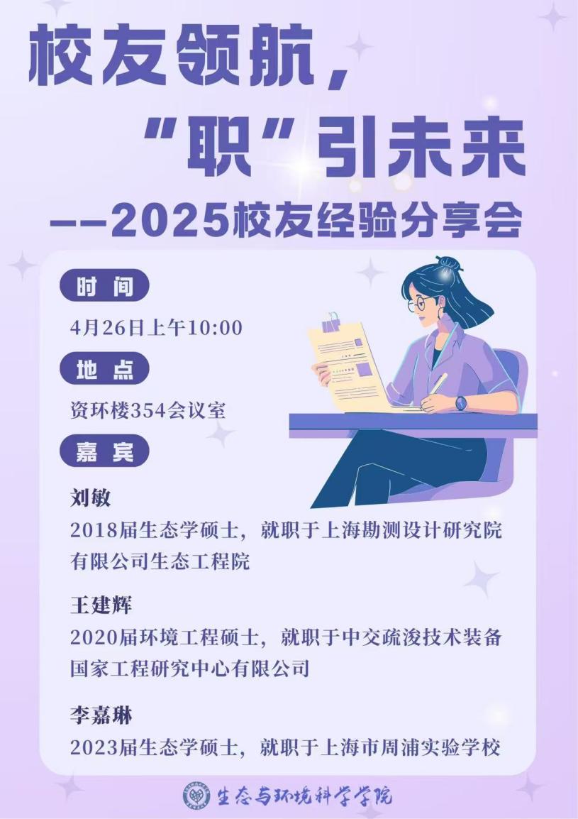 为助力同学们明晰就业态势、把握专业就业前景,确立科学的就业择业理念,合理规划职业发展路径,强化求职竞争力,2025年4月26日上午10:00在闵行校区资环楼354教室,黄色直播 举办“校友领航,‘职’引未来——2025校友经验分享会”。活动邀请生环学院2018届校友刘敏、2020届校友王建辉、2023届校友李嘉琳三位嘉宾结合自己的工作经历和感悟进行分享。活动由院研会生涯部负责,王九洲同学主持,40余名同学参加此次分享会。