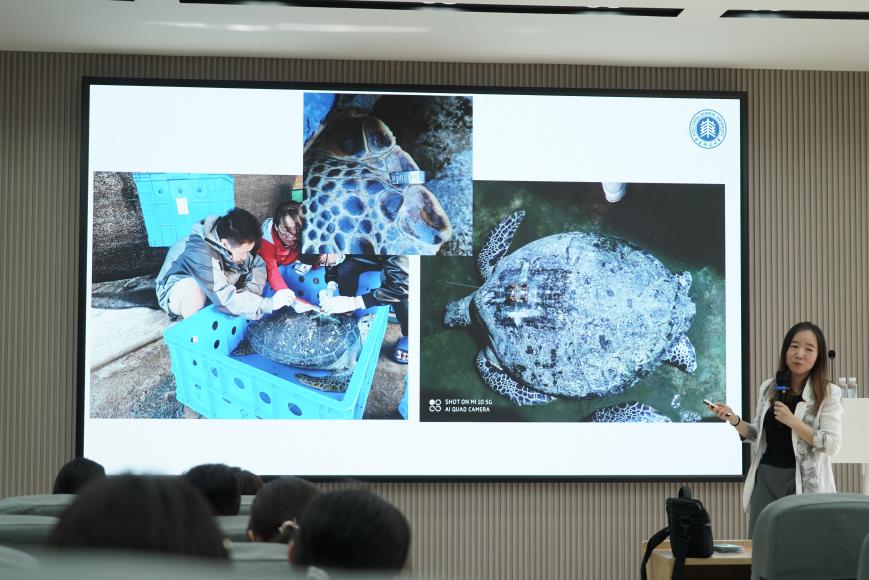 陈老师深入浅出地讲解,让我对海龟这一领域有了全新的认识。这些与恐龙同时代的海洋"活化石"正面临多重生存危机:过度捕捞导致海龟误捕死亡率攀升,沿海开发致使80%的天然产卵场消失,塑料污染更让幼龟生存率骤降。同时,陈老师展示的卫星追踪洄游图、人工繁育的幼龟群、修复如初的金色产卵场,又让我看见科学与坚守的力量。作为青年学生,我深切体会到生态保护并非遥不可及:拒绝非法海龟制品、参与海岸线清理、支持可持续渔业,皆是守护行动的具体落脚点,每一个微行动都在重续这份1.5亿年的生命史诗。