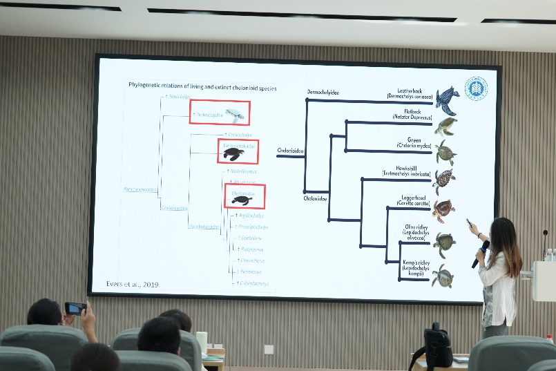 陈老师首先以“800磅重的恐龙样的海龟棱皮龟登陆在佛罗里达海滩岸筑巢”这一引人入胜的现象为切入点,带领大家一同回溯海龟类从三叠纪一路走来的漫长历程。海龟作为海洋“活化石”,曾与恐龙同处一个时代,是全球海洋生态系统的关键指示物种。然而,这些在地球上存活了上亿年的古老生物,如今却因人类活动而陷入重重生存危机。全球7种海龟中,6种已被列为受威胁物种,其中在我国海域分布的绿海龟、玳瑁等5种更是被列为国家一级重点保护动物。