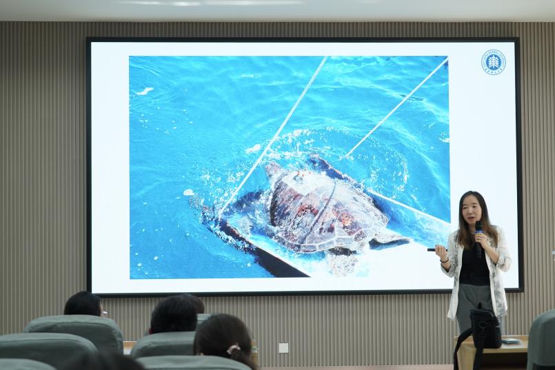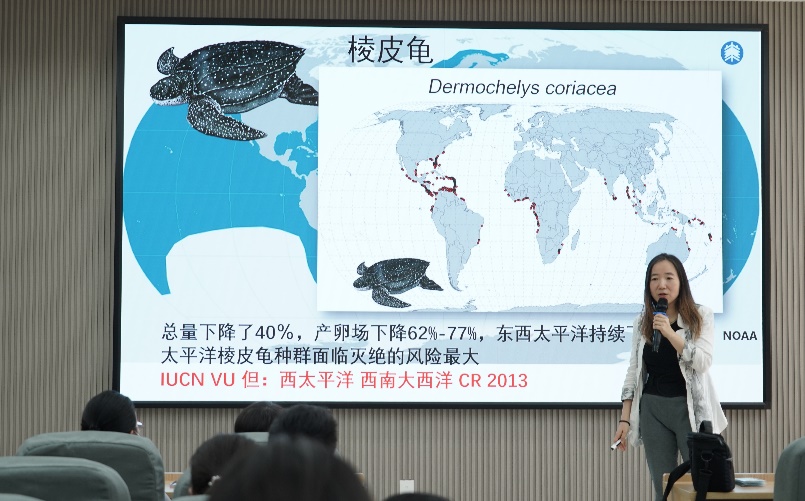 陈老师深入剖析了海龟当前面临的严峻形势,用详实的数据展示了各类海龟种群数量的下降趋势,凸显了这些古老生命所遭遇的巨大威胁。过度捕捞、非法贸易、海洋污染、塑料垃圾、沿海开发以及气候变化等多种因素正持续加剧着危机。面对如此困境,陈老师并没有停留在揭示问题的层面,而是向大家积极地展示出了多种切实可行的保护措施,诸如国际条约的约束、保护区的建立、人工繁殖技术的探索以及栖息地的修复等。她还结合自身经历,介绍了团队放归海龟,并通过定位追踪芯片追踪海龟的洄游路径,以了解海龟的生活习性及栖息地生态环境的故事。