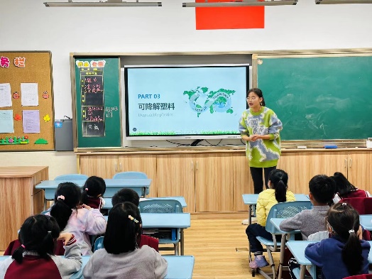 讲师们挑选了其中一个大家熟知的解决方式进行了介绍—使用可降解塑料。然而,为什么有好的解决办法却无法大面积普及呢?讲师们解释了主要的三点原因:价格高、保存时间短、难回收。最后,讲师们带领小朋友们一起朗读了一段环境宣传语,在朗读声中结束了本次的小课堂。