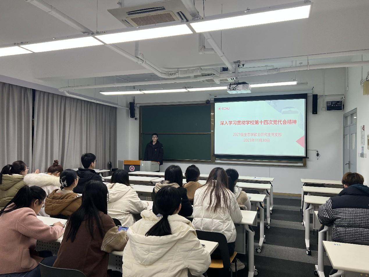 为深入学习习近平总书记关于教育的重要论述,贯彻学校第十四次党代会精神。2023年11月30日晚,生环学院2021级生态学系硕士研究生党支部在闵行四教203开展学习第十四次党代会精神专题组织生活,本次主题生活由支部书记刘啸林带领大家学习。