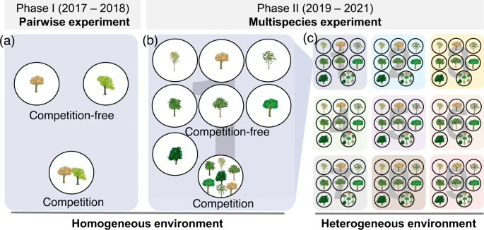 研究团队围绕处于竞争劣势的植物如何维持自身种群这一问题,进行了为期3年的幼苗实验,并基于10个乔木物种6750株幼苗的10个关键功能性状,全面系统地检验了不同情境下种内性状的变化特征。