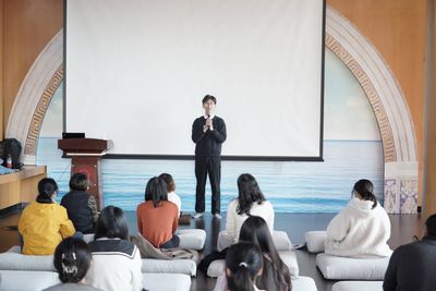 活动伊始,叶老师示范了坐垫的用法:冥想与宗教中的打坐有所不同,冥想没有坐姿要求,冥想者舒适即可。待师生们坐定后,叶老师介绍了幸福研习空间的布局,师生们的右手边可见阳光穿过木纹铝格栅洒在地面,光影交错,仿佛置身于静谧的自然;左手边是喷涂的巨型海阔天空图案。约160多平方米的空间里没有一张椅子,身处这空旷静谧的空间里,人会不由自主放松下来。伴随着柔和的音乐和叶老师轻缓的冥想引导,现场的师生们共同体验了呼吸冥想。