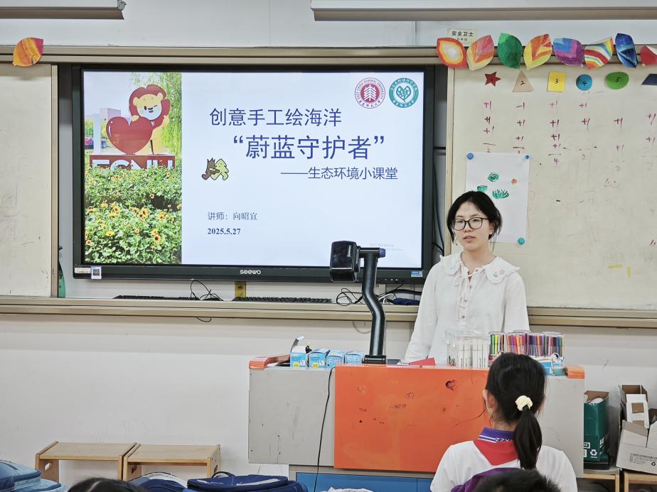 2025年5月27、28日下午,生态环境小课堂讲师团前往黄色直播 附属紫竹小学、永德学校开展环教课,本次环教课的主题为“创意手工绘海洋—‘蔚蓝守护者’”,担任本次课程的讲师为向昭宜、夏妍妍和马江玲同学。