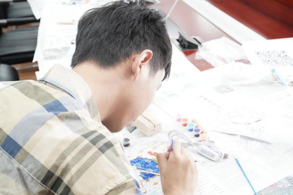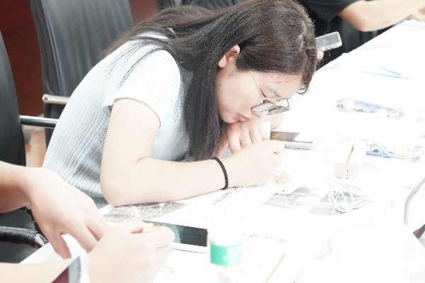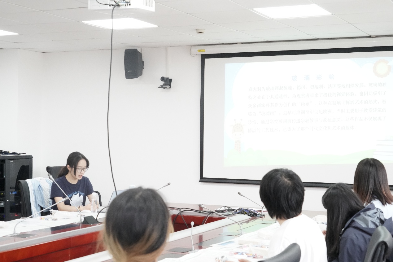 活动现场,桌面上整齐陈列着玻璃画板、丙烯颜料套装及不同型号的彩绘笔。张海心同学为参与者详细讲解了玻璃画的创作方法——从底色铺陈时颜料与稀释剂的比例控制,到利用多层透明色叠加营造光影透视效果的诀窍,并现场展示了多幅成品画作,直观呈现了玻璃材质与色彩交织产生的独特艺术效果,为同学们的创作提供了参考范例。