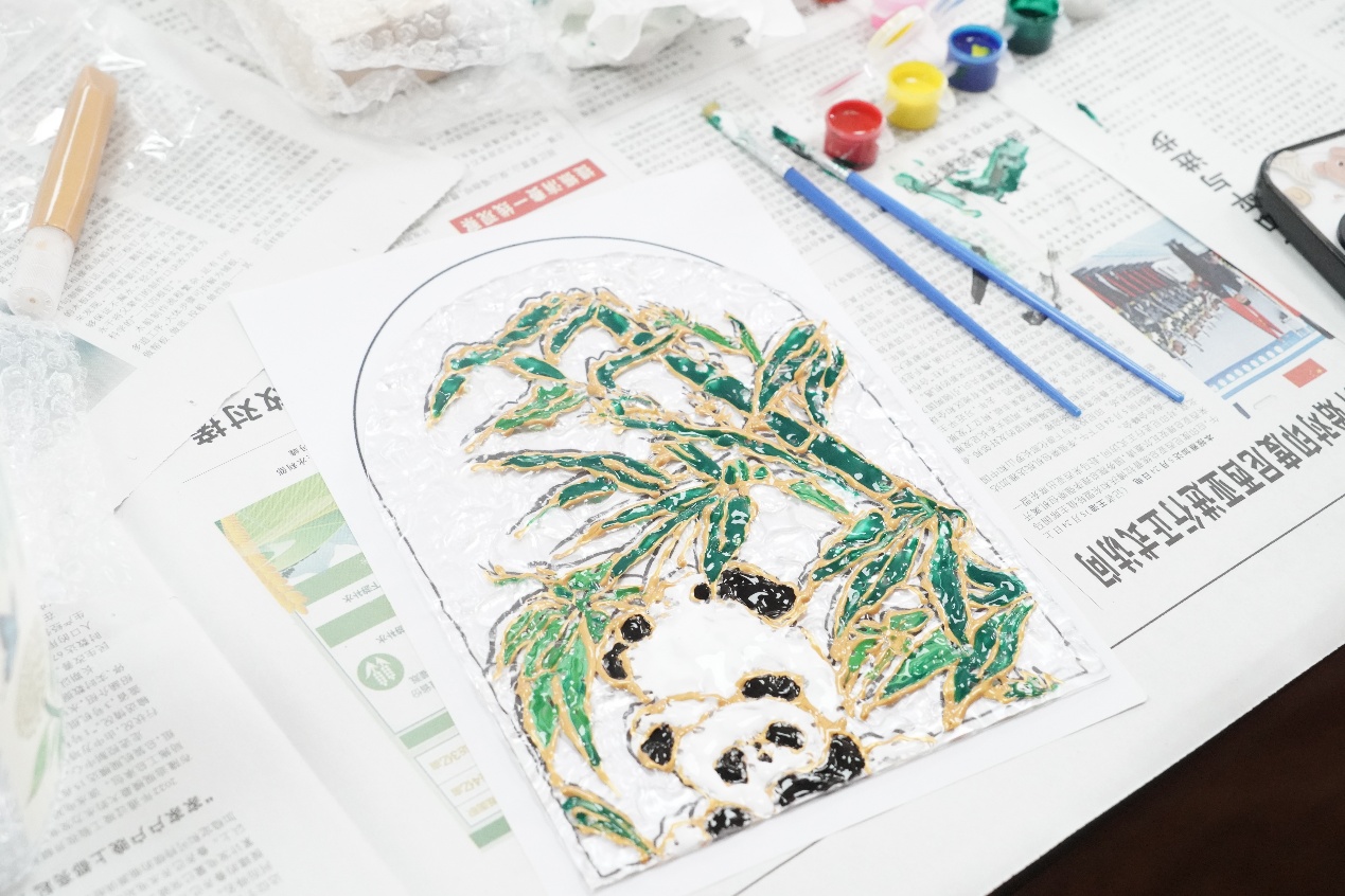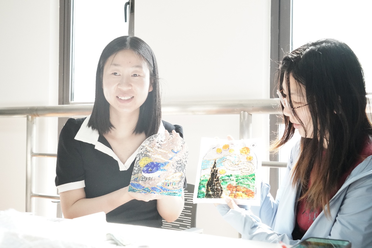 在创作环节,同学们手持彩绘笔于玻璃画板上挥洒创意,让每幅作品都独具艺术韵味。经过构图、上色、修边等工序,空白的玻璃画板渐变为一件件艺术品。现场氛围热烈,同学们交流着色技巧与创作思路,既收获了亲手绘制的玻璃画作品,更在创意互动中增进了同窗情谊。