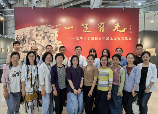 之后,支部党员前往图书馆参观“一生有光:光华大学建校百年纪念文物文献展”,共同学习光华大学在现代中国教育史上波澜壮阔的发展历程。“学人翰墨”板块中诸多大夏先贤的手泽真迹,“文献集珍”板块中毕业证书、期刊杂志和合影照片蕴含了光华大学发展的历史细节,“大夏光华”板块展示了大夏大学、光华大学两所学校教授或校董的书作及相关文献。大家认真聆听志愿者对展品背后故事的讲述,时而驻足凝视书画手稿,时而俯身细观陈列的照片原件。