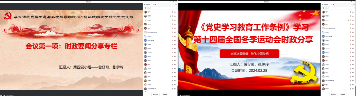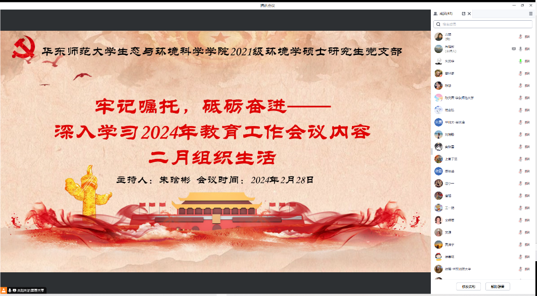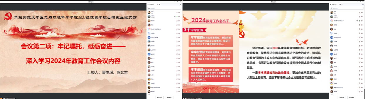 2021级环境学硕士研究生党支部开展“牢记嘱托,砥砺奋进——深入学习2024年教育工作会议内容”专题组织生活。本次活动通过腾讯会议网络平台开展,包括“时政要闻分享、理论党课学习”两个部分。本次活动由第四党小组主持,全体党员线上参会。