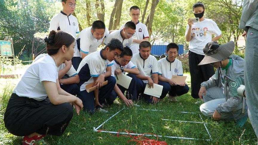 图8、9:《丈量美丽中国》课程组师生与高中生交流并在校园内开展生态学样方调查