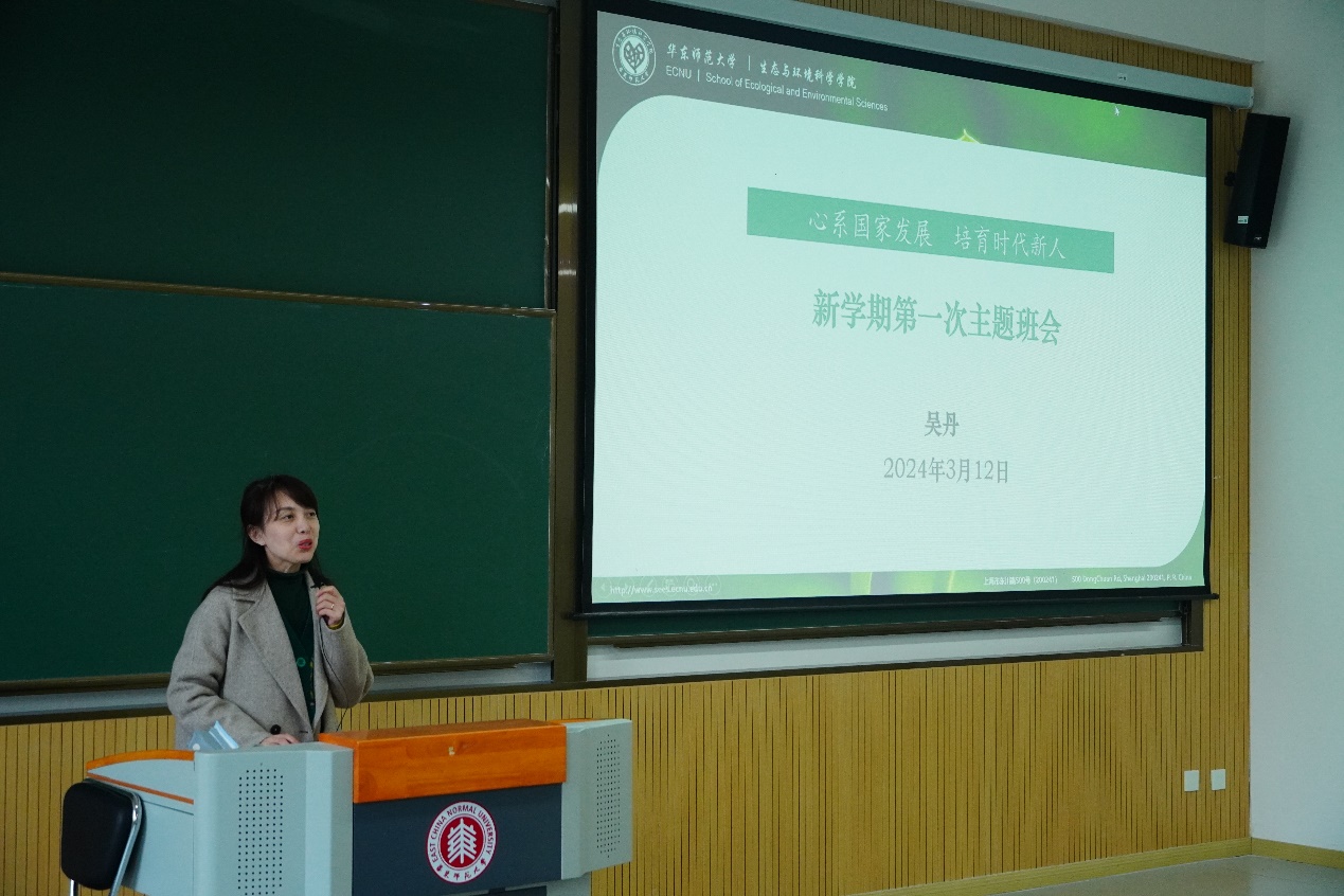 首先,吴丹以“心系国家发展 培育时代新人”为主题开展了新学期第一次主题班会,通过“回顾上学期”总结了半年来班级各项活动的开展情况和成效。在启航新学期部分,她以“强思想、乐学习、多实践、重双创、爱生活”五个方面,就新学期的主要工作提出建议与期盼:第一,强思想:希望同学们通过“学习强国、青年大学习”等平台开展思想理论学习,提升自身的政治理论素养,筑牢理想信念的基石;第二,乐学习:以生环优秀学子为榜样,激励同学们刻苦学习,永攀科研高峰;第三,多实践:详细介绍了学校、学院开展的各项实践活动,鼓励同学们积极参与,展现生环学子的责任与担当;第四,重双创:介绍了学院双创工作开展情况和学科相关赛事,引导同学们参与各类创新创业大赛,提升创新精神和创业能力;第五,爱生活:引导同学们筑牢安全意识,养成健康规律的生活习惯,营造一个健康、活力、向上的学习生活氛围。
