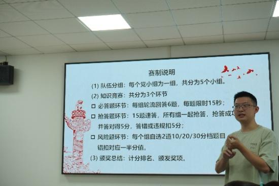 随后,彭铖详细介绍了包含必答题、抢答题和风险题三个环节的竞赛规则,其中必答题着重考察党史基础知识,抢答题考验选手反应速度和知识储备,风险题则通过差异化分值设置激发参赛者的挑战精神,整个赛制设计既严谨规范又充满趣味性,充分体现了"以赛促学、以学促行"的活动宗旨,通过竞答检验和提升同学们对党史与校史的掌握情况。