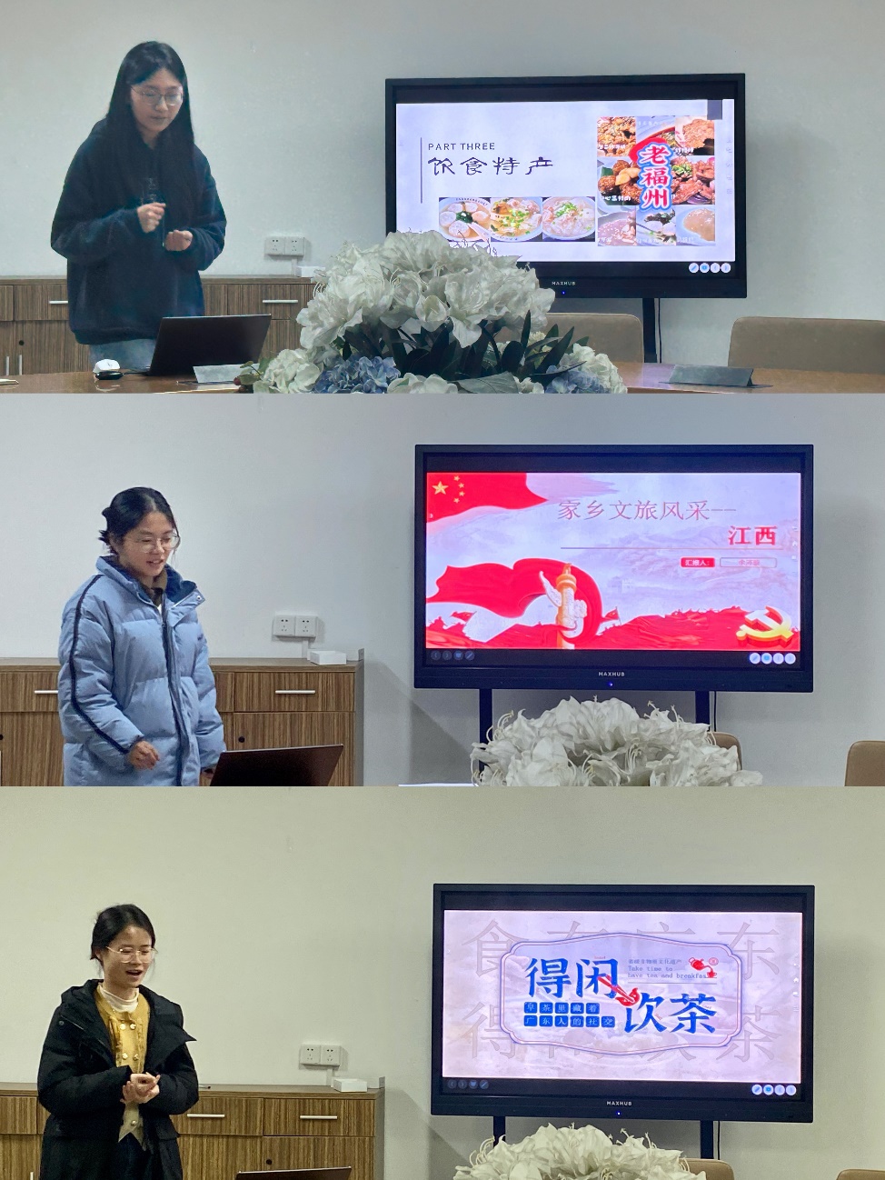 第二组是来自包邮区的江浙沪的四位同学。来自上海的谢逸轩向我们分享了他的“魔道三见”;来自江苏的薛晨怡从“自然景观”“人文景观“多角度出发向大家分享了无锡的情况;来自浙江的卢正扬从视频切入,向大家展示了一个被誉为文化名城、园林城市、宜居城市、幸福城市的台州之美;来自浙江的包兴燕,向大家详细介绍了湖州的南浔古镇及莫干山等名胜古迹。