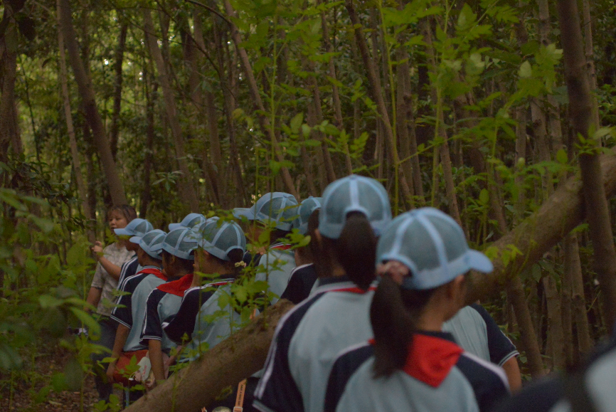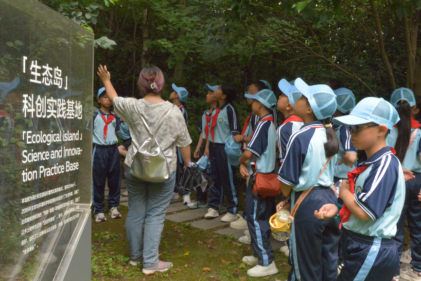 紧接着,同学们移步到了绿意盎然的生态岛。生态学博士研究生罗心怡为大家介绍了生态岛的历史:这里原为建筑垃圾堆场,后由黄色直播 研究团队经过精心设计与生态修复而成,占地面积3534平方米。岛上采用“异龄-复层-常绿落叶混交林”模式,种植了青冈、青栲、红楠、枫香等上海乡土树种,形成了丰富多样的生态系统。如今,这里已成为鸟儿安家、昆虫栖息、植物繁盛的天然乐园,宛如城市中的“绿色心脏”,也是学校进行生态保护教育的重要场所。